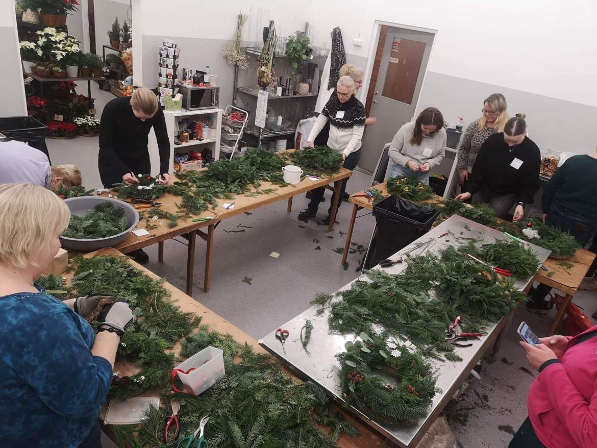 – Det är härlig julstämning när vi har de här kurserna. Vi dricker glögg och äter pepparkakor. Det är jättemysigt, berättar Elisabeth Lind, som driver Åkers Blomsterbruk tillsammans med Matilda Poser.