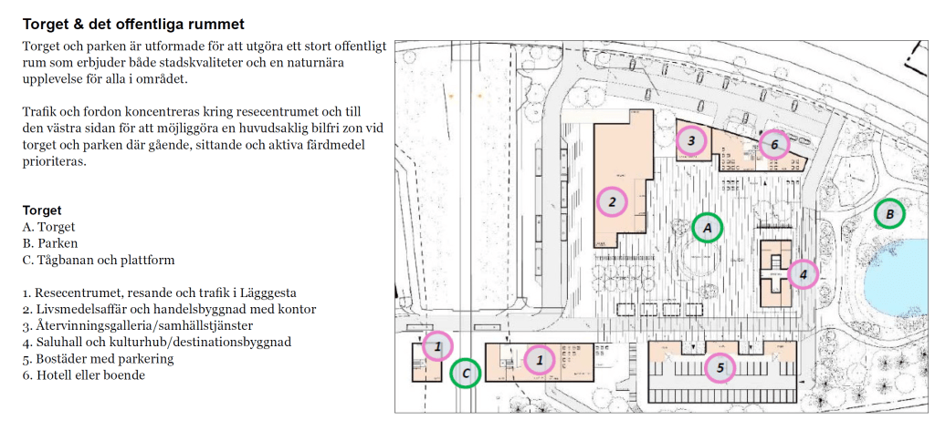 I förstudien beskriver man hur Läggesta stationsområde kan bli en levande mötesplats med väntrum och kommersiella ytor, där det också kan finnas kulturutbud och samhällsservice.