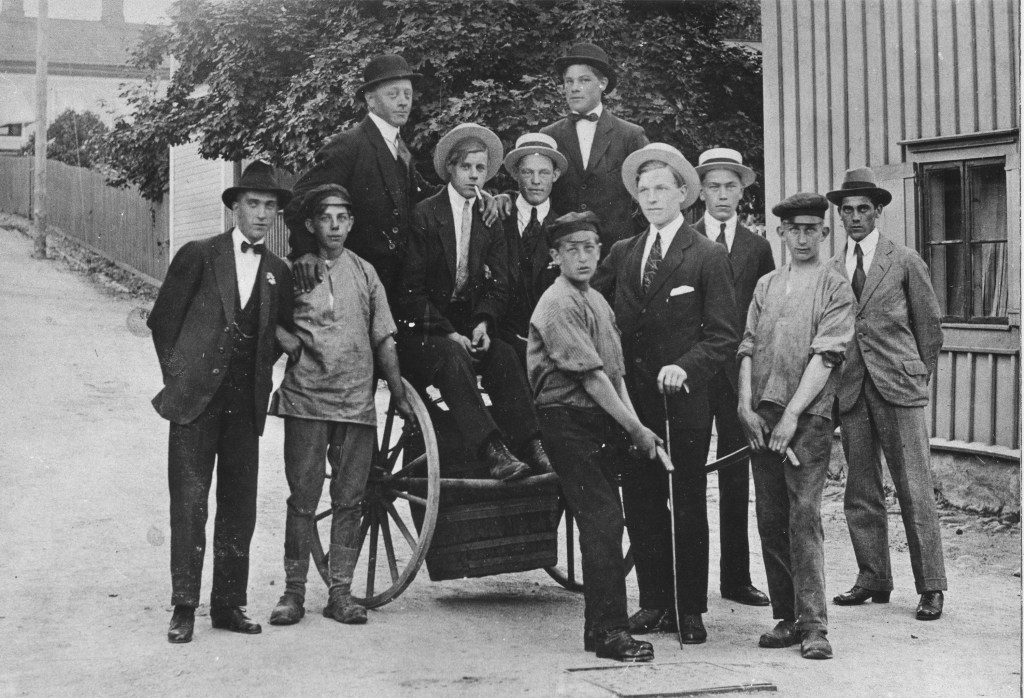 Ungdomar som står vid en vattenkärra utanför Bellmansgården i Mariefred. Foto Ture Ekman Sörmlands museums arkiv