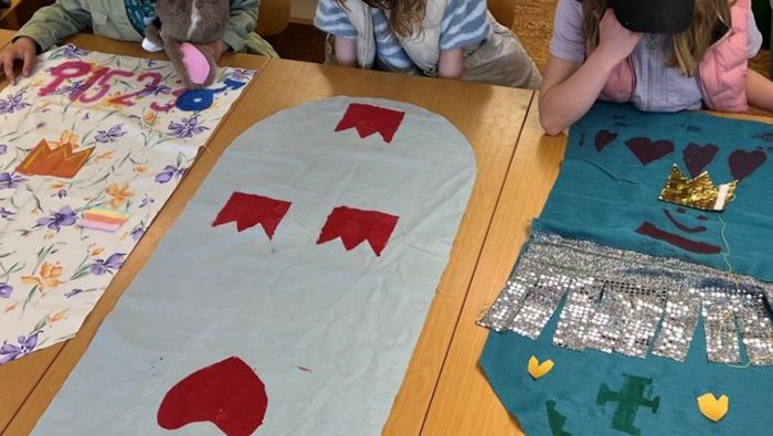 – Textiltryck var roligt. Då tog vi kopieringspapper, sen ritade vi på det och klippte ut det vi hade ritat. Sen strök man fast det på sin flagga och tog textilfärg med en pensel och penslade på. När man var klar kunde man dra bort och hänga på tork. Det var mycket svårare med kronorna, att få de att sitta fast på tyget. Vi hoppas att de inte är för tunga, berättar eleverna i årskurs 3.