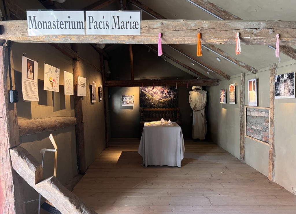 I den del av bodlängan som ligger närmast mangårdsbyggnaden pågår en utställning, som berättar om det katolska kartusianerklostret Monasterium Pacis Mariae, numera förenklat benämnt Pax Mariae (Marias fred), som för länge sedan var beläget på platsen. Mariae är den latinska genitivformen av Maria. Munkklostret täckte förmodligen en stor del av den norra delen av Callanderska gården, större delen av kullen där Mariefreds kyrka nu återfinns samt merparten av den mark, som omfattar Gripsholms Värdshus byggnader. Resten av hembygdsgårdens och värdshusets marker stod förmodligen under vatten vid den tiden. Klostret var verksamt mellan åren 1493 och 1526 och dess korta existens beror på Gustav Vasas reformation av kyrkan samt hans intresse för och habegär beträffande marken där klostret var beläget. I klostrets ägor ingick också borgen Gripsholm samt flera fastigheter och hemman, som munkarna hade fått via donationer. Dessutom fanns även mycket tegel och annat byggnadsmaterial samt åtråvärda guld- och silverföremål i klostret, som också kunde vara av intresse för en girig konung.