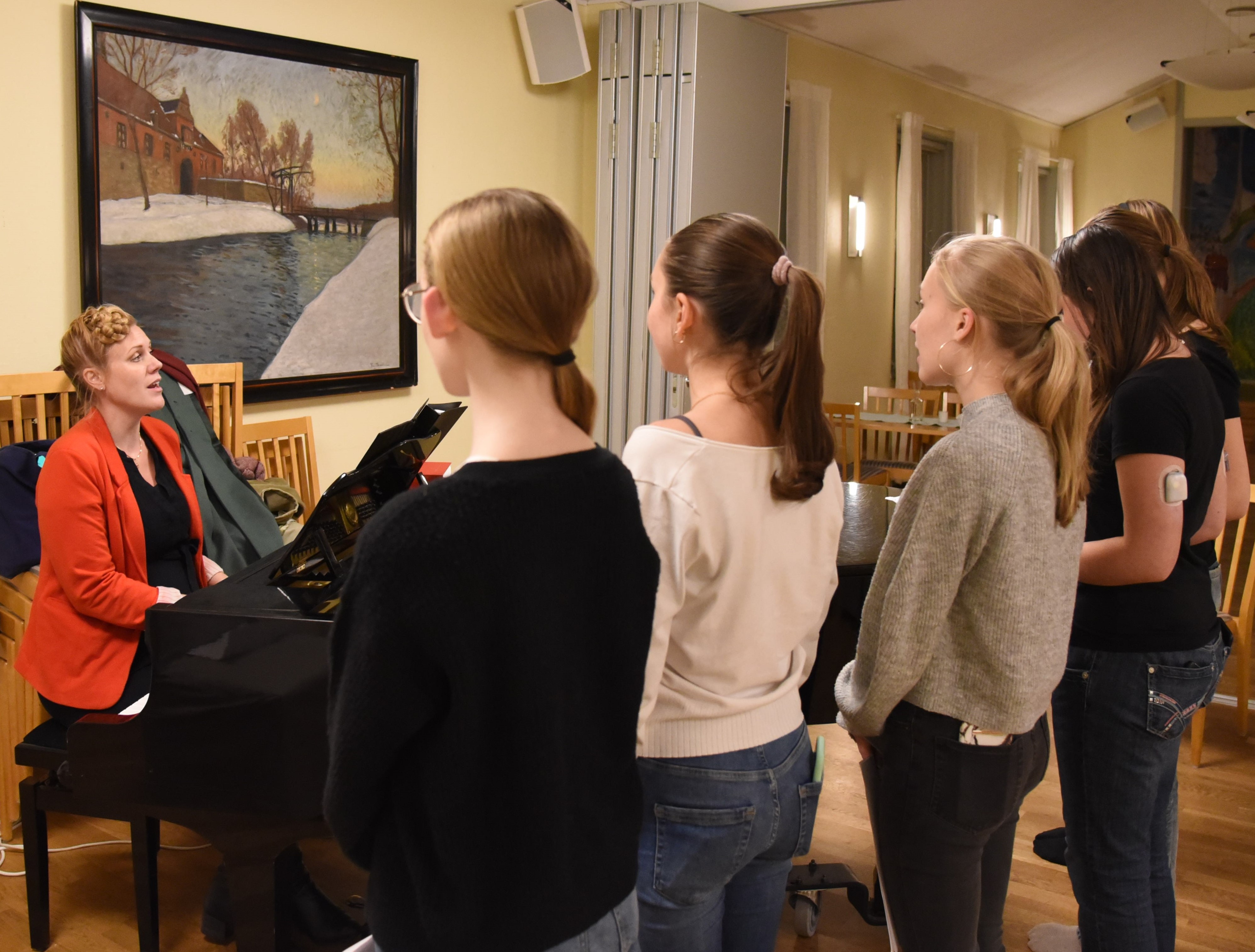 Åtta ungdomar har anmält sitt intresse att vara med i luciafirandet och repar nu med Frida. Under luciagudstjänsten kommer de att sjunga tillsammans med Fridas egen kör Tongriparna.