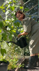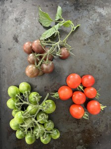 September närmar sig och det är läge att vara lite mer radikal. Alla tomatgrenar som inte har någon tomat med färg kapas av, gurkplantorna kortas in och bladen på zucchinin som snart täcker hela jordgubbsraden klipps bort. De små söta tomaterna hamnade i en syrlig paj, de gröna i en härlig chutney med doft av kardemumma. Recepten kommer här. Smaklig läsning!