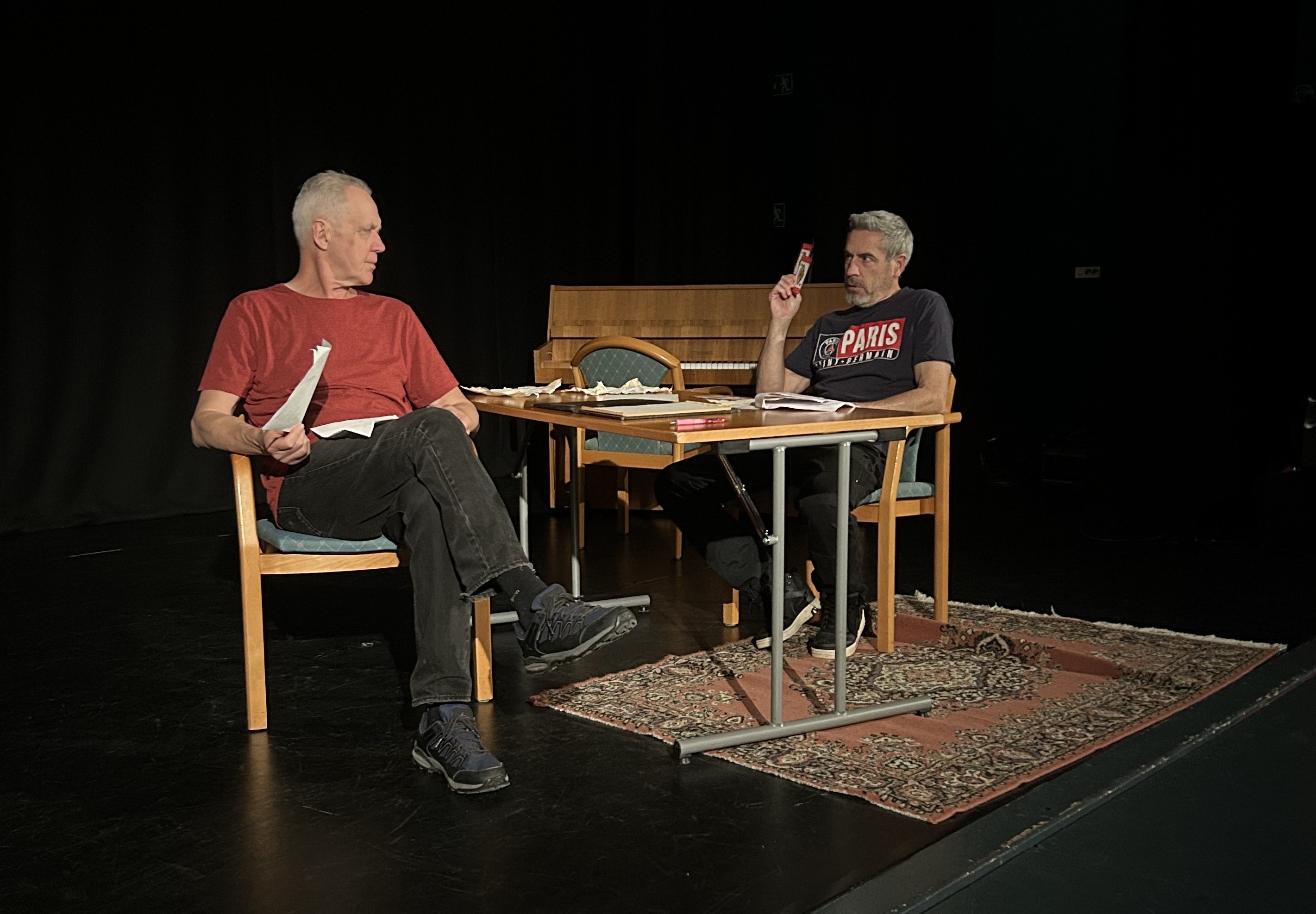 Genom att Doktor Glas i Fredriks pjäs spelas av två skådespelare blir det tydligt att olika tankar och känslor i doktorn tävlar om utrymme, förklarar Fredrik.