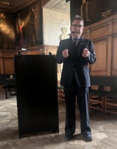 Rikssalen var fylld till sista sittplats och Jim erinrade sig, att under slottets första lunchföredrag 2015 var tolv (12!) åhörare närvarande. Således har intresset för föredragen ökat markant under åren. Jim upplyste om att han ämnade berätta om Gustav Erikssons väg till tronen. Namnet Vasa fick kungen långt senare. Det knepiga med berättelsen är, att den består av flera delar, såsom skolbokshistorien och dessutom nyare teorier om hur det verkligen förhöll sig om man bortser från smått förskönande krönikor, som Gustav själv säkert låg bakom. Jim benämnde därför kungen ”Sveriges förste influenser” och det kan således vara lite svårt att skilja de olika versionerna åt.