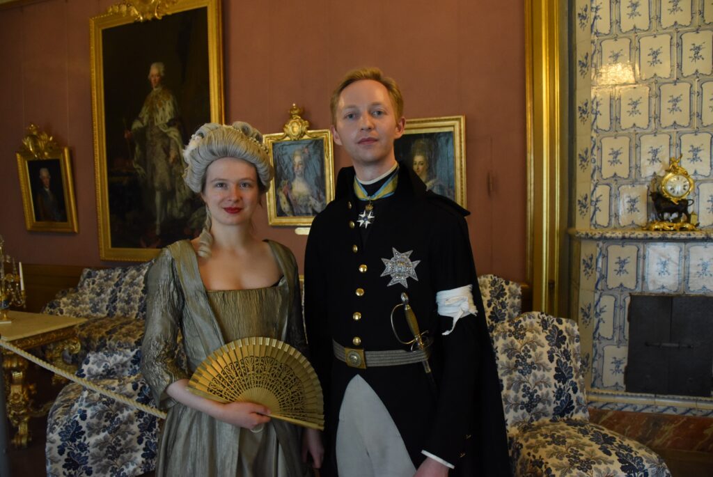 En trappa ned återfinns Gustav III gemål Sofia Magdalena tillsammans med sin son Gustaf IV Adolf i drottningens våning. Felix Härenstam och Louise Smith, som annars guidar på slottet, har fått många frågor idag.