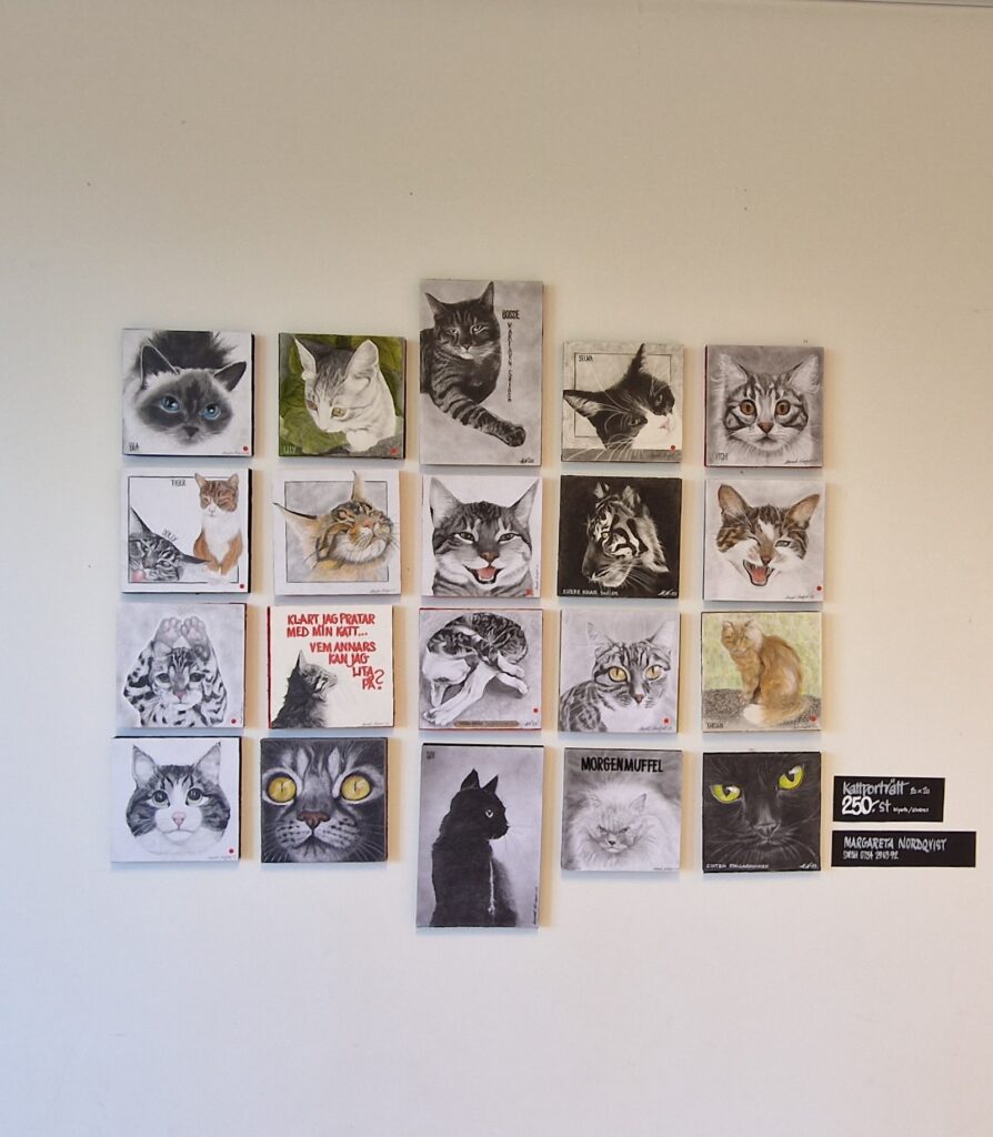 Här är katter i alla färger, former och storlekar. Margareta har använt olika tekniker som akvarell och blyerts när hon förevigat de många katterna.
