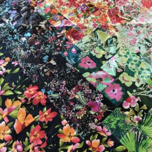 - Det är så kallade patchworkstyger eller lapptäckstyger. Det är 100 procent bomull och ligger på en speciell bredd som passar när du ska skära till lapparna. Vi klipper aldrig utan vi skär.