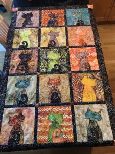 - Man tar sin ”topp” som är lapparna man sytt samman och lägger en vadd och en baksida. Sedan quiltar man det tillsammans så det blir ett täcke, en väggbonad eller någonting annat vadderat, förklarar Kari.