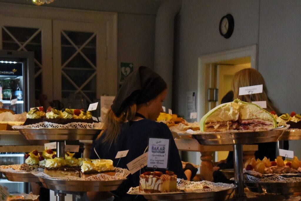Många av de som åker till Taxinge lockas av kakslottet och de många bakverken man kan njuta av där. Till Slottscaféet är det också en kö som aldrig tar slut den här dagen. Therese Thunström och hennes sällskap har rest från Nyköpng. De är på gott humör och har inget mot att spendera lite tid i kön för att fika på det berömda kakslottet. För de som ville avvakta lite med kakorna och istället shoppa var butikerna i slottets flyglar som Klädverket och Taxinge Slottsbod också öppna under dagen.