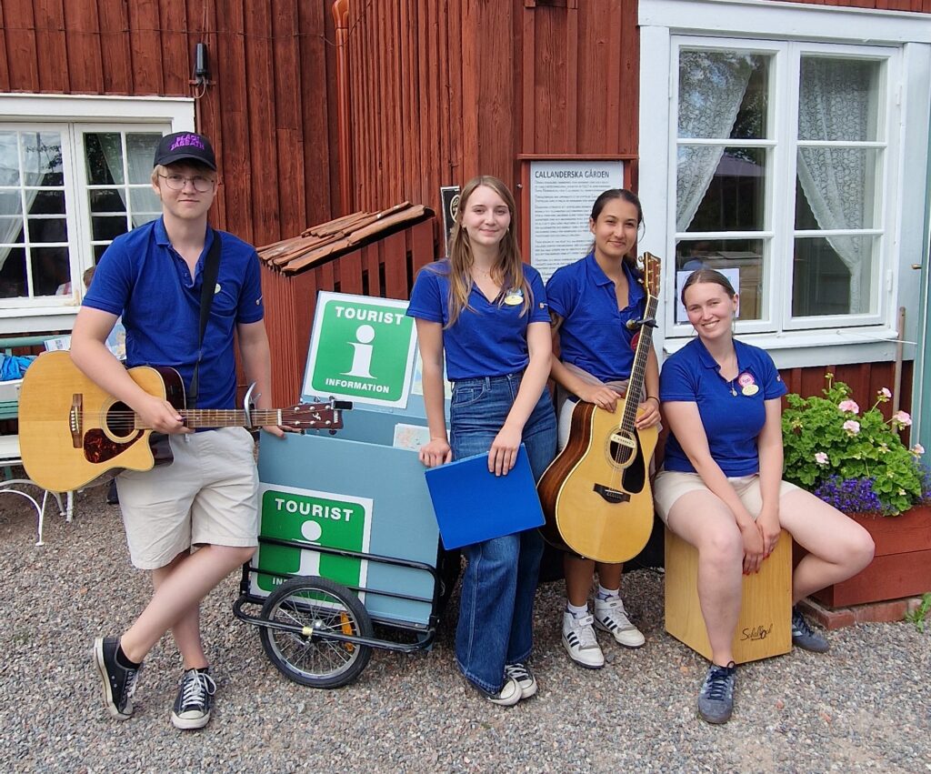 - Vi är spontana och har en bil och en lådcykel till vårt förfogande. Vi åker dit där det är folk, berättar Charlotte Noreen som tillsammans med Nathalie Karlsson, Max Eklund och Tindra Möller Björö under sommaren både spelar musik och ger turistinformation.