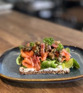 Smörrebröd med kallrökt lax, mango chutney, friterad kapris och bacon