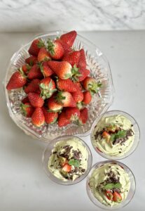 Pistagemousse med jordgubbar och choklad