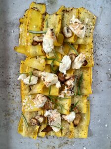 Zucchiniplättar med chèvre och smörstekta kantareller