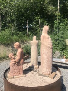 Förra året, när de öppnade örtagården, fick ägaren Ina M Andersson tips om en konstnär vid namn Lena Lervik och blev genast nyfiken. I år har Lenas Madonnaskulpturer fått ta plats i örtagården. När hon började med sina skulpturer 1975 var det en annorlunda tid.