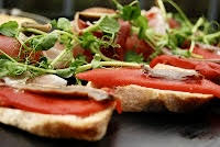 • På tunna skivor av t.ex gårdagens baguette läggs grillad paprika och toppas med en sardell.