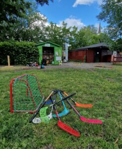 Intill lekplatsen i Lottenlund står Fritidsbankens aktivitetsbod. Runt omkring på gräsmattan har Emma och de andra ledarna ställt upp ett litet pingisbord, en käpphästbana, innebandyutrustning, små bilar och mycket annat som alla är välkomna att använda.