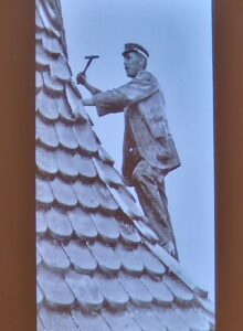 På det sättet är det en äventyrlig verksamhet att reparera taket på kyrktornet. Bengt visar några bilder från reparationerna som gjordes förra året inför jubileet. Dessutom fick vi se ett foto från 1921, då säkerhetsföreskrifterna inte var lika noggranna som idag.