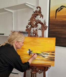 Naturen är en stor inspirationskälla för Caroline. Motiven i hennes konst är så gott som uteslutande djur i olika miljöer. Caroline visar en målning med två älgkalvar som simmar, som hon gjorde för ett tiotal år sedan.