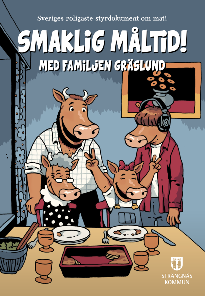 Nu kan man ladda serietidningen ”Smaklig måltid med familjen Gräslund” på Strängnäs kommuns hemsida. Gräslunds är en familj i koskepnad som i tidningen träffar andra människor i form av olika djur. Familjen Gräslund tar del av kommunala måltider, men de har svårt att äta på grund av olika anledningar och beger sig till kommunen för att klaga. De går till äldreboendet, korttidsboendet och skolan, där de får lära sig mer om hur kommunen arbetar med maten.