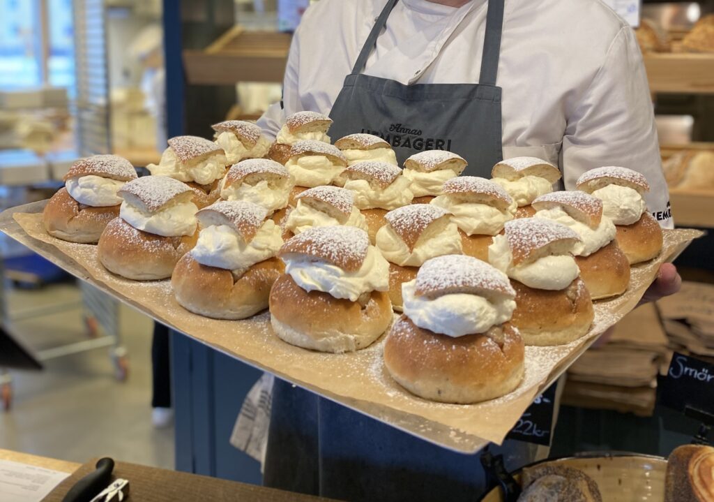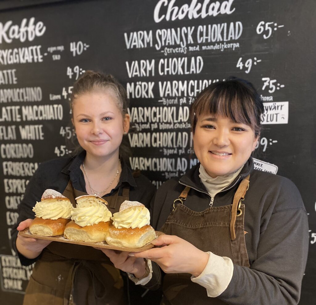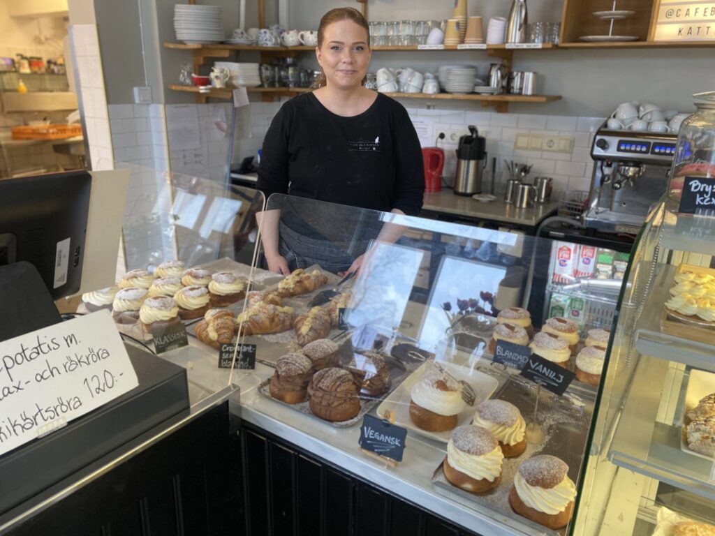 – Det har gått åt mycket mer än vad vi hade förväntat oss, det är jättemånga som har kommit och köpt semlor redan nu på förmiddagen och vi har fått in många beställningar också. Det är jätteroligt, säger Sandra Edvinsson, barista på Café blå katten.