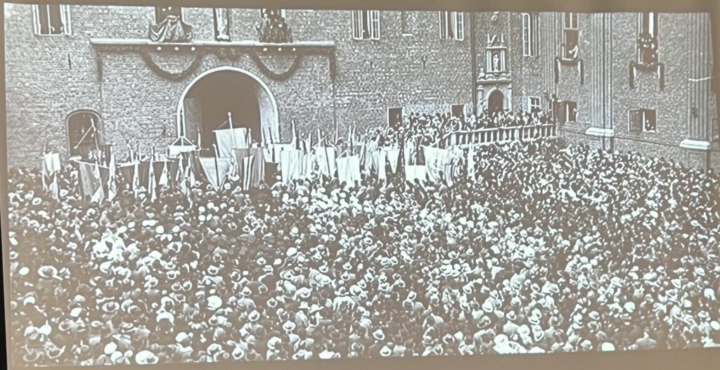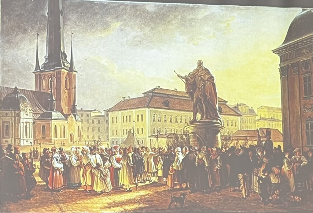 – Det här var mitt första möte med Gustav Vasa, sa Jim och förevisade en bild av en staty föreställande kungen på sin tron på Nordiska museet, som Jim besökte som barn och den sex meter höga jätten lär ha skrämt den lille gossen rejält. Tanken på hur stor kungen skulle vara om han reste sig, var inte lätt för lille Jim att handskas med och hans föräldrar tvingades lugna honom med att gubben inte var levande, trots att hans stränga blick föreföll uppenbar. Carl Milles var skaparen av statyn, som avtäcktes 1925.