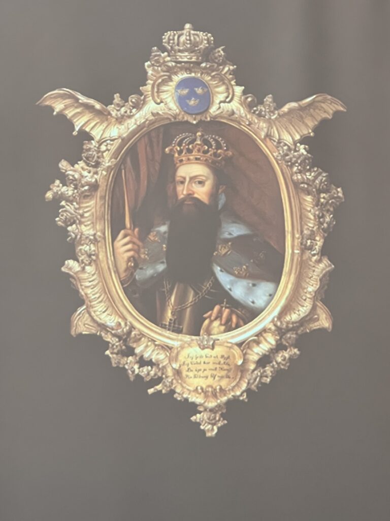 Jim visade också upp ett fint porträtt av den yngre Gustav Vasa, från sent 1600-tal/tidigt 1700-tal. Bilden är omgiven av en prålig guldram, som bär inskriptionen ”Jag tjente Gud och Dygd, Jag Vårdat har mitt Rike, Du äger ju mitt Namn, Min Tehlning blif min like”, som lär ha varit riktat till den unge Gustaf III.