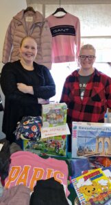 Bakom ett bord, där man bland annat kunde hitta kläder, pussel och serietidningar står Veronica Edvinsson och Malin Sjöö.