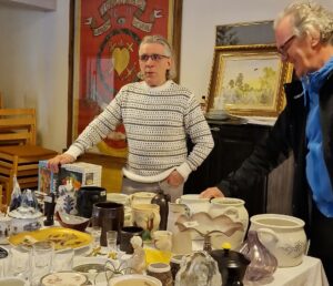 Maria Ståhlberg, som står vid sitt bord en bit bort, tycker också att det är roligt att sälja på loppis ibland. På sitt bord har hon bland annat mycket vackert porslin, glas, och en fin gammal klocka.