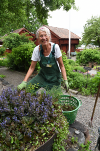 Eva är själv aktiv i trädgårdsgruppen och loppisgruppen. Hon tycker att det som är fint med hembygdsgården i Mariefred är att det blir en samlingspunkt för människor.