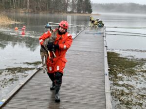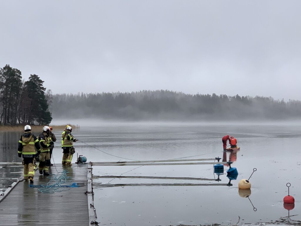 Räddningstjänsten använde en pulka för att köra rådjuret till land. Foto: Marie Hillblom