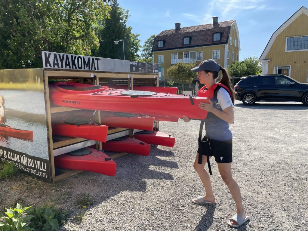 I lådan finns det tre solokajaker, tre tandemkajaker och tre SUP:ar. Alla tillbehör ingår i uthyrningen – såsom flytväst, kapell om man inte vill få vatten på sig, öskar för att hasa ur vattnet, och en paddel. För sjösättning finns en liten strand och brygga strax intill kayakomaten.