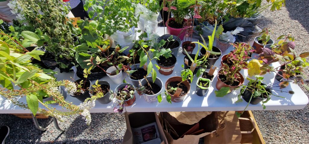 För trädgårdsföreningen är växtbytet i full gång. Alla som tagit med sig en eller flera plantor frön eller blommor har fått ett nummer och sedan går man laget runt och väljer.
