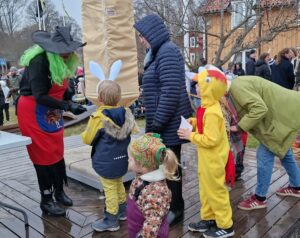 Som vanligt var det de två häxorna Tussan och Morran med på Rådhustorget för att träffa de många påskfirarna. Vädret var lite blött, men utrustade med kvastar och häxhattar som de var var regnet ingen stor utmaning. Tussan noterade ändå att det vanligtvis brukar vara soligt.