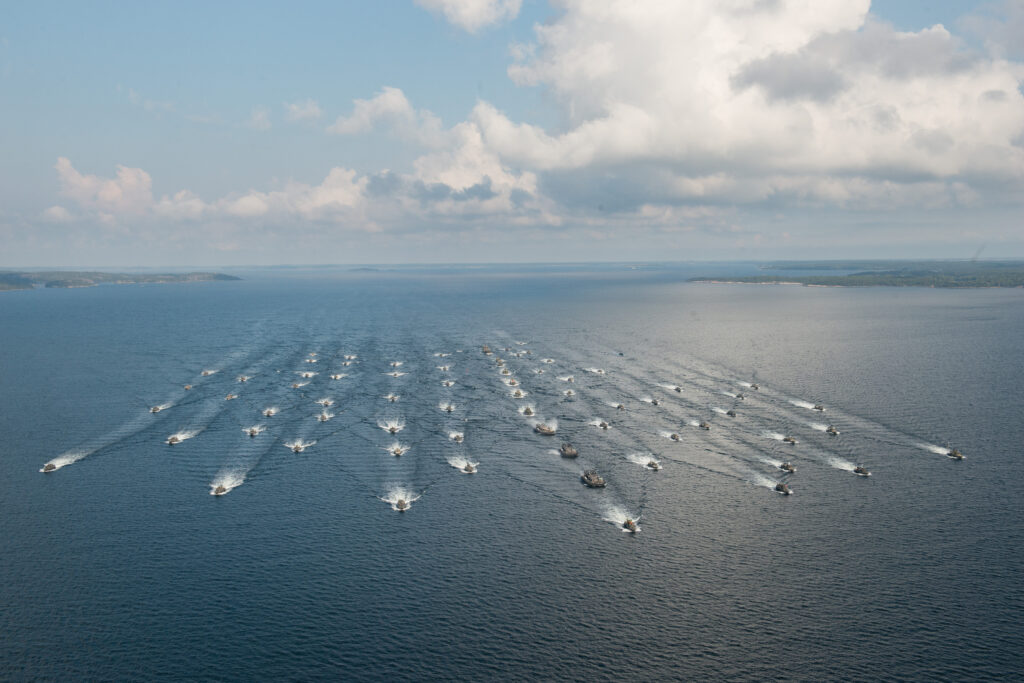 Hela andra amfibiebataljonen rycker fram i formation med cirka 70 fartyg över Mysingen i Stockholms södra skärgård under övning Aurora 2017.