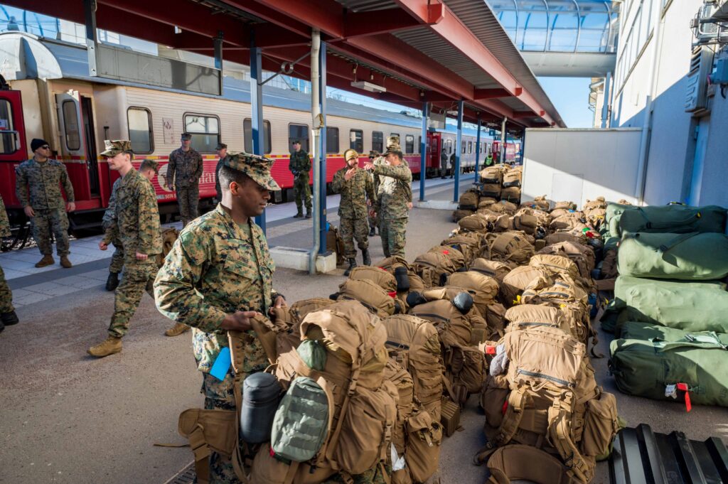 Mekaniserade bataljonen rycker fram längs E18 under Aurora17.Amerikanska marinkårssoldater anländer till Skövde inför försvarsmaktsövning Aurora 23.