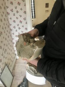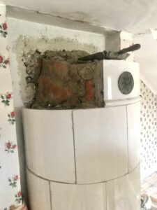 När han monterar ner en kakelugn knackar han lite lätt med en gummiklubba tills det lossnar. Det händer att kakelplattor spricker och man behöver byta ut dem. Vita kakelugnar är svårast att hitta nya plattor till eftersom det finns så många varianter av vitt.