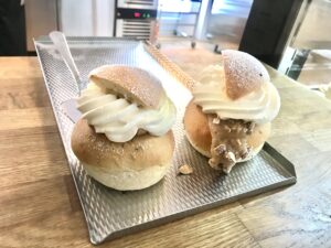 Förutom vanlig semla och lyxsemla säljer de crossiant-semla, vegan-semla, gluten- och laktosfri-semla, vaniljsemla och minisemla.
