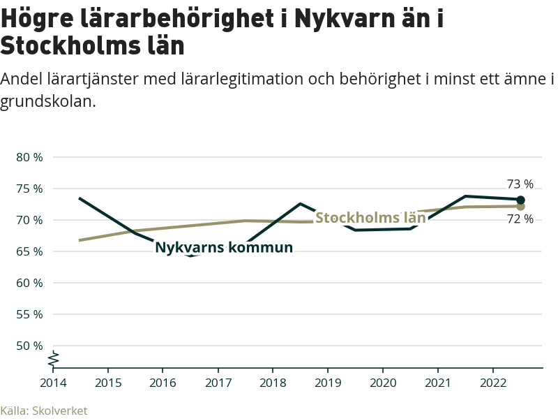 I oktober 2022 hade motsvarande 73 procent av lärarna1 i grundskolan i Nykvarns kommun lärarlegitimation och behörighet i minst ett ämne.