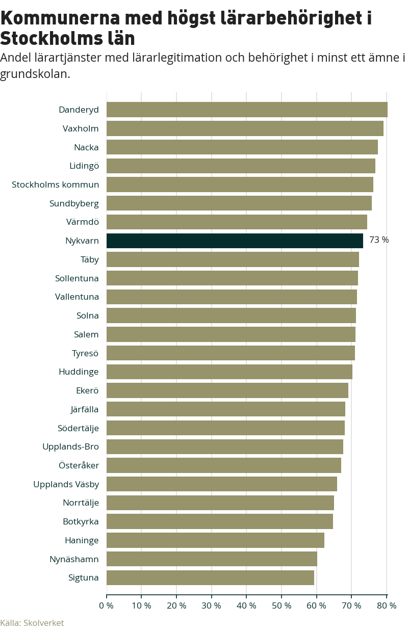 Lärarbehörigheten i Nykvarns kommun ligger kvar på 73 procent, vilket är över snittet för hela landet. Det visar ny statistik från Skolverket som Sveriges Lärare idag analyserar för samtliga kommuner och län.