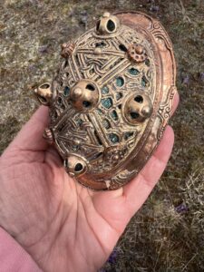 Sofia visade också upp en kopia ett dräktspänne i brons, liknade de som återfinns i kvinnogravar och därtill ett pärlband som skulle sammanfoga de båda spännena. Sofia daterar föremålen till ungefär 900-tal. Pärlbanden, som skickades runt bland de intresserade, bestod också av berlocker, såsom ”Klahammar-mannen” och även mynt, både arabiska och frankiska samt en avporträttering av ”Birka-flickan”. Sofia underströk också att vikingarna förmodligen var mycket mer färgglatt klädda, än vi tror. Fynd som har gjorts tyder på att de var väl bevandrade i växtfärgning.