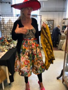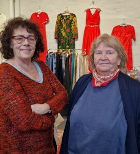 Kersti hittar kläderna till catwalken i sin vintageshop. Birgitta har även hon vintage från sin butik plus en del nysydda kreationer. Här har hon samarbetat med Kari Morell från Samverket, som gjort en del av tygerna.