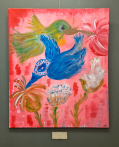 Målningarna på utställningen är färggranna och naivistiska. Motiven är ofta hämtade från naturen.