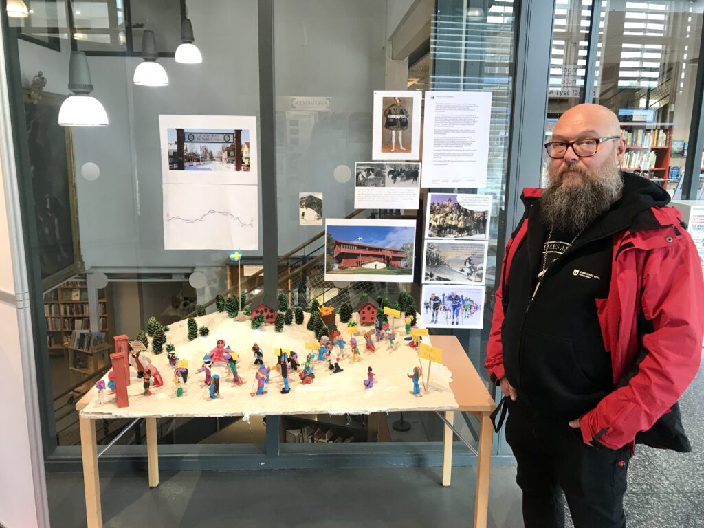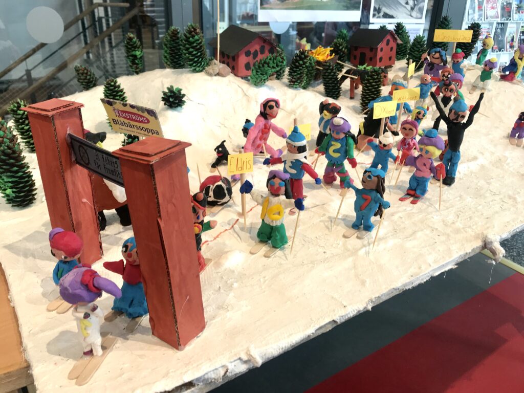 Husen är gjorda av kartong, granarna av kottar och gubbarna av lera. Det svåraste med att jobba med lera har varit att få gubbarna att stå still på samma ställe, men med Vasaloppet fanns en till svårighet som skapade lite diskussioner i klassrummet.