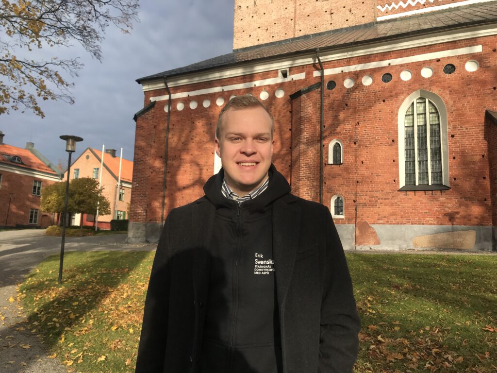 Erik har spenderat många år av sitt liv i domkyrkan. Hans morfar var kyrkvärd och aktiv i kyrkorådet och under sin uppväxt var Erik aktiv både som medlem i barnkören och som konfirmand. Efter två år i Mora är han nu tillbaka på hemmaplan, som en del av praktikprogrammet Ung resurs.