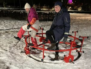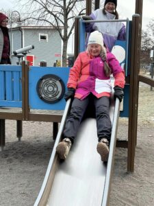 Under träffarna blir deltagarna modigare och modigare. Första gången de skulle ta sig över ett klätterställ i lekparken var det lite skrämmande, berättar Hannele.