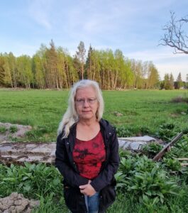 Susanne står vid den faluröda gården med flera uthus, som numera drivs av hennes son. Familjen har brukat marken och levt invid skogen sedan 1908.