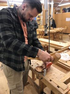 Andreas är ett av årets nya tillskott. Han gör en skål av en vril, en utväxt från ett träd. Det här är Andreas andra gång i slöjdsalen. Han gillar gemenskapen och att allt finns på plats.
