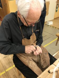 Bosse är av slöjdarna på plats. Han gör smörknivar och bestick till barnbarnen. Han har även snickrat större saker som bord och stolar. Just nu jobbar han med en smörask. Bosse har varit med sedan starten för tjugo år sedan.