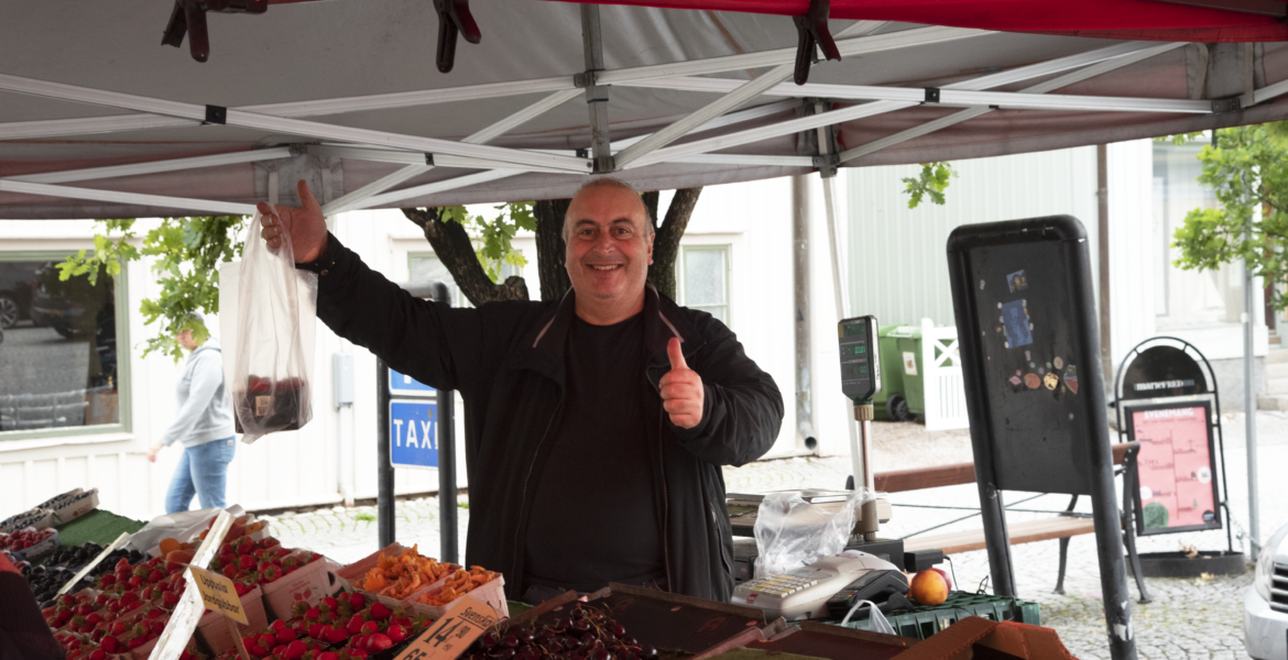 MariefredFör sista gången den här säsongen plockar Aydin Tunc fram sina bär, frukter och grönsaker. Det är säsongsavslutning för torghandeln. Aydin trivs med att jobba i Mariefred.